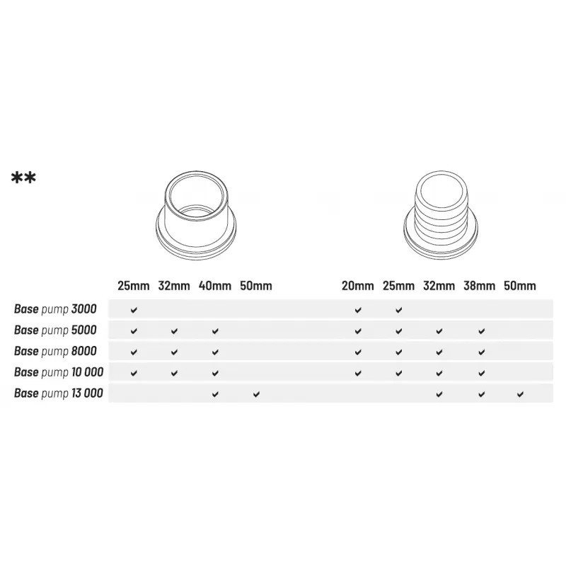 Connexion tuyau sortie d'eau : 20 mm, 25 mm, 32 mm, 38 mm